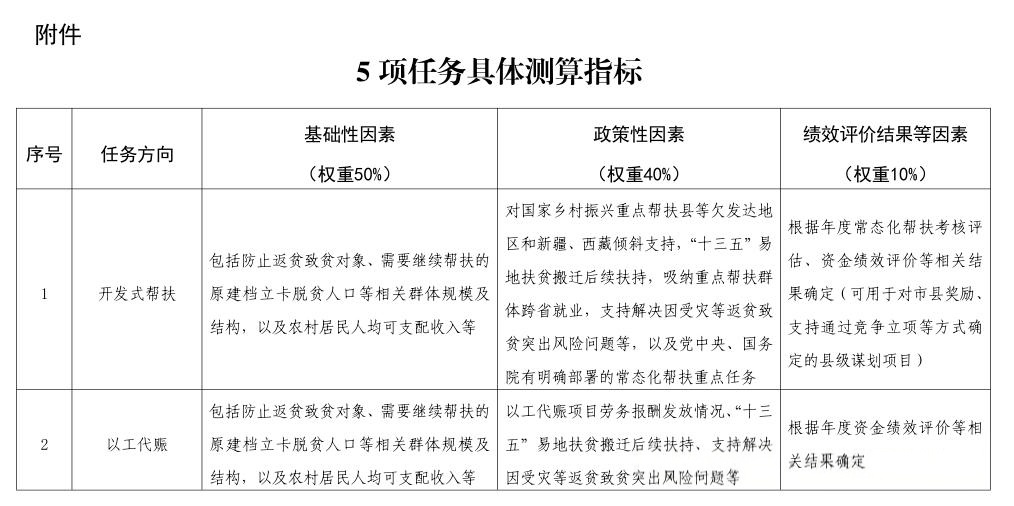第三条 帮扶资金分为开发式帮扶、以工代赈、少数民族发展、欠发达国有农场巩固提升、欠发达国有林场巩固提升、“三西”农业建设6个任务方向。