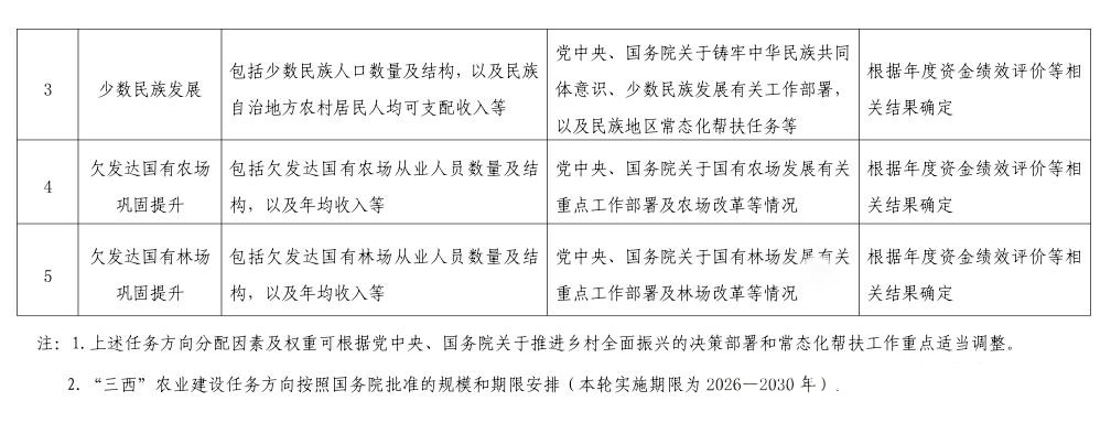 第六条 帮扶资金采取因素法分配,测算因素包括:基础性因素、政策性因素、绩效因素,并统筹考虑保障各地财政运行稳定性、常态化帮扶工作需要等情况进行适当调节。任务方向按照上述因素分别确定具体测算指标和权重(详见附件)。“三西”农业建设任务方向按照国务院批准的规模和期限安排(本轮实施期限为2026—2030年)。对于党中央、国务院有明确部署的常态化帮扶特定事项、区域等可适时采取定额等方式分配。各省收到帮扶资金后可全部采取因素法分配,具备条件的可主要采取因素法、对县级申报的部分产业项目适当采取项目法分配,项目评审和资金补助等由省级明确。