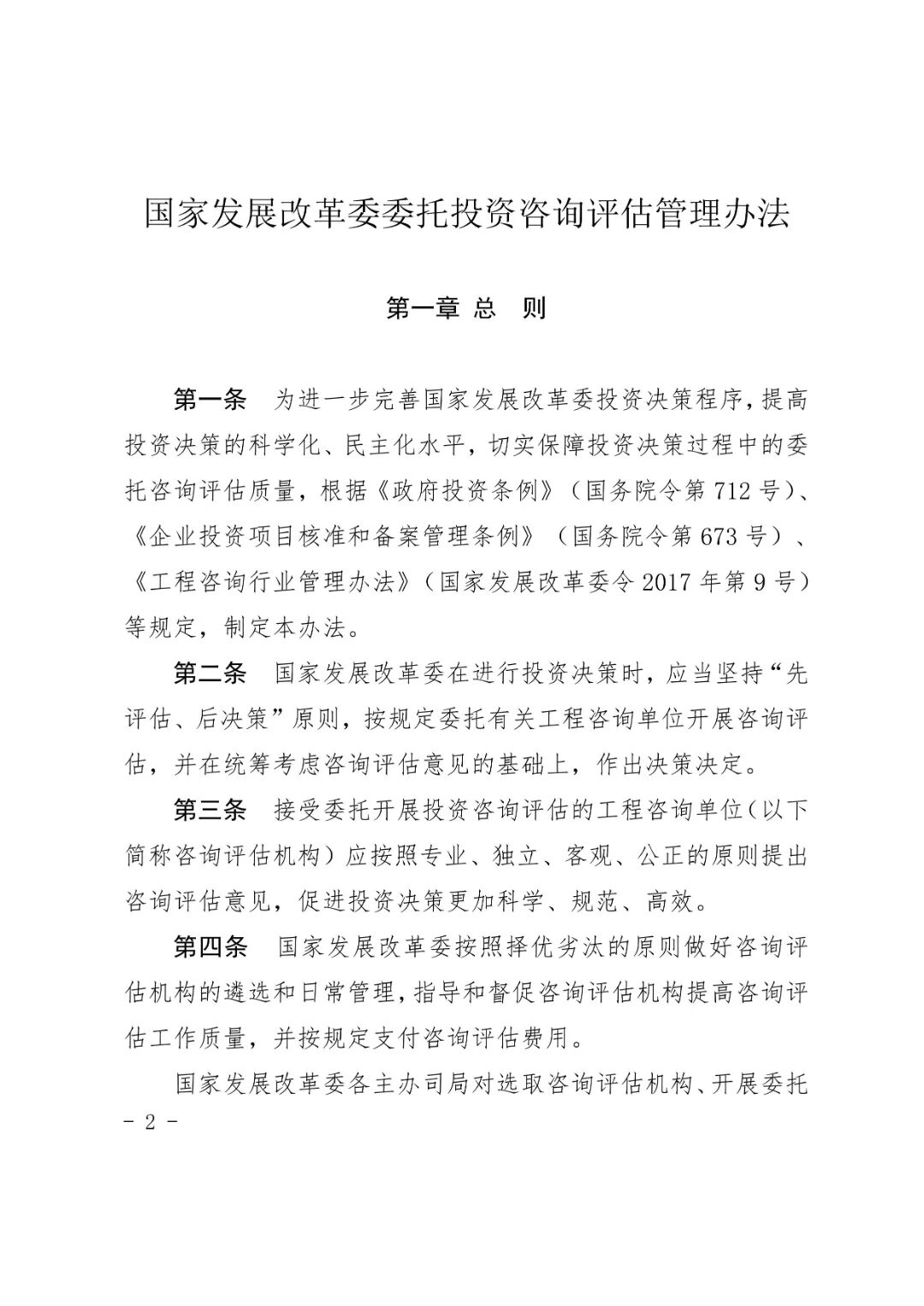 为进一步完善我委投资决策程序,提高投资决策科学化、民主化水平,规范投资决策过程中的委托咨询评估工作,我委对《国家发展改革委投资咨询评估管理办法》(发改投资规〔2022〕632号)进行了修订。现将修订后的《国家发展改革委委托投资咨询评估管理办法》印发给你们,请按照执行。